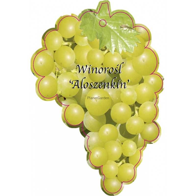 Aloszenkin - odmiana deserowa, o bardzo wczesnej porze dojrzewania. Dorasta do 3 - 5 metrów wysokości. Owoce średniej wielkości , część jagód beznasienna , lub tylko z jednym drobnym nasieniem .Grona bardzo duże stożkowate ,wielokrotnie rozgałęzione, luźne do średnio zwartych. Na dobrych stanowiskach masa gron przekracza często 1kg. Jagody owalne , średniej wielkości , skórka zielonożółta , w pełni dojrzałości złocista z brunatnym rumieńcem . Miąższ kruchy zrośnięty ze skórką , smaczny o neutralnym aromacie , Odmiana wysokourodzajna dająca 8-10 kg owoców z krzewu.